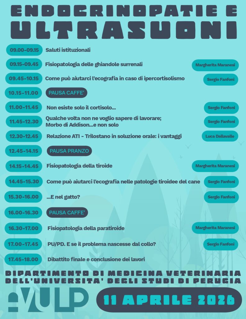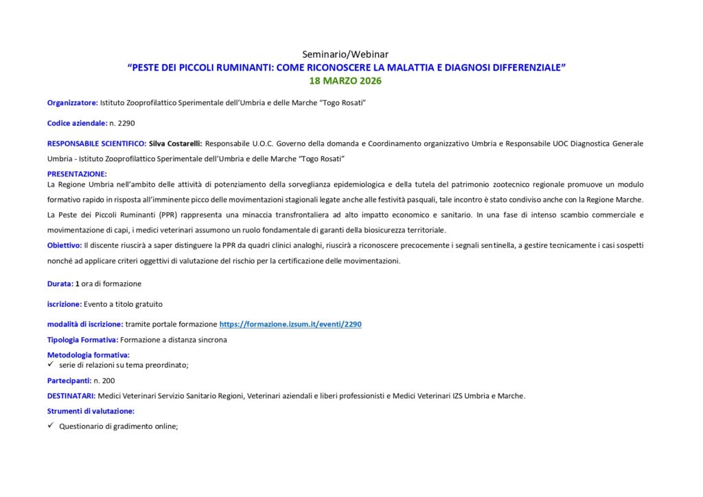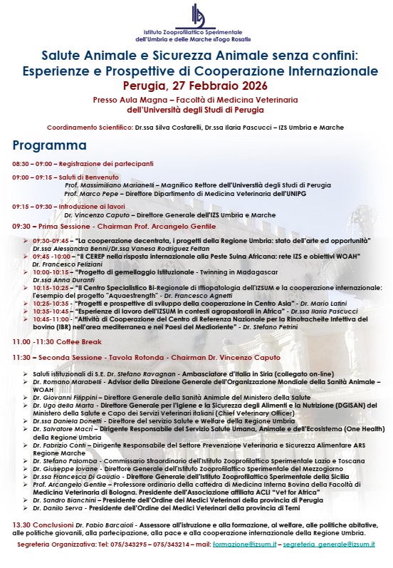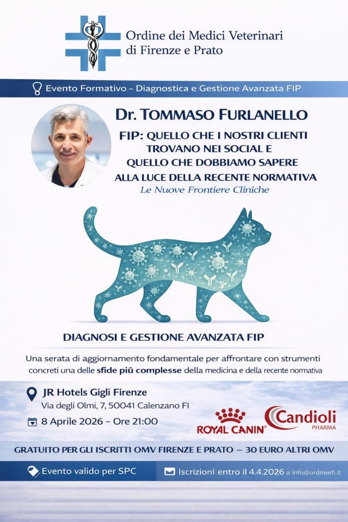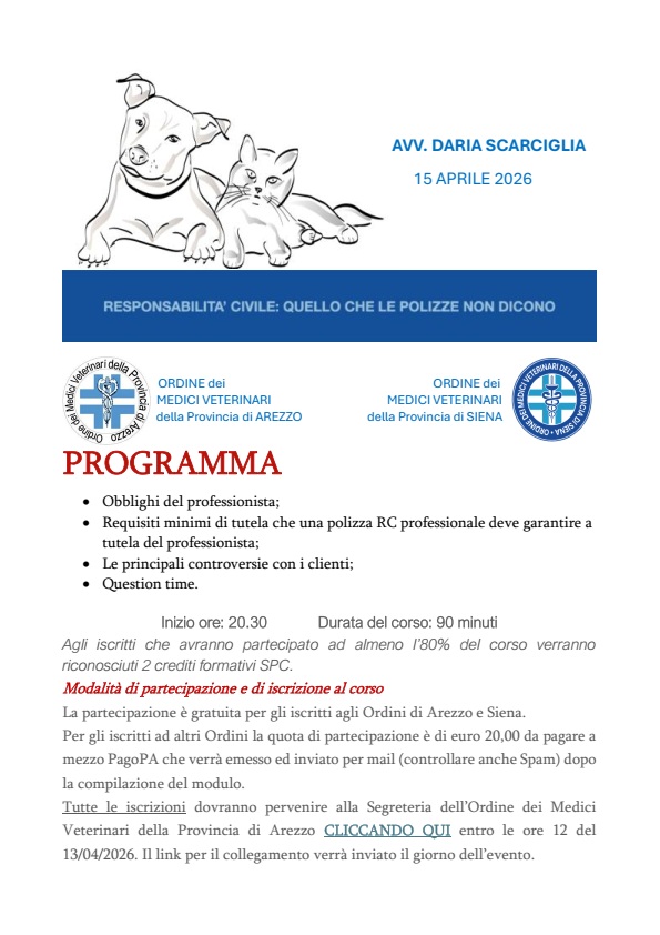 Aggiornamento Professionale Formazione FORMAZIONE ORDINE ARCHIVIO 2025 (7) ▼ IL CANE IN AMBIENTE URBANO: GARANTIRE IL SUO BENESSERE E UNA CONVIVENZA SERENA CON LE PERSONE E ALTRI ANIMALI 08 Novembre 2025 IL CANE E L'AMBIENTE URBANO: QUANDO UNA GIUSTA SCELTA PUÒ FARE LA DIFFERENZA 29 Settembre 2025 AGGIORNAMENTI SUL WEST NILE VIRUS 17 Settembre 2025 IN CITTA' CON IL MIO AMICO A 4 ZAMPE 14 Giugno 2025 IL DOMANI INIZIA OGGI: STRATEGIE PRATICHE ED INNOVATIVE PER L’ORGANIZZAZIONE DEL LAVORO 13 Aprile 2025 LA GESTIONE DELLA RICETTA VETERINARIA E DEI CONTROLLI 26 Marzo 2025 LA DEONTOLOGIA DEL MEDICO VETERINARIO NELLA PRATICA PROFESSIONALE 06 Marzo 2025 Uso corretto degli antibiotici e strategie condivise contro l’antibiotico-resistenza Febbraio 24, 2026 Leggi tutto -> Giornata Nazionale per la Prevenzione Veterinaria Gennaio 26, 2026 Leggi tutto -> AGGIORNAMENTI IN DERMATOLOGIA EQUINA: TUMORI, LESIONI E INNOVAZIONE (FOTOBIOMODULAZIONE E LASERTERAPIA) Gennaio 19, 2026 Leggi tutto -> LA VISITA DEL CAVALLO SPORTIVO: UNA COMPETENZA VETERINARIA Gennaio 15, 2026 Leggi tutto -> RECENSIONI NEGATIVE, DIFFAMAZIONE, ATTI DI AGGRESSIONE: COME DIFENDERSI E AUTORITA’ COMPETENTI Gennaio 7, 2026 Leggi tutto -> IL CANE IN AMBIENTE URBANO: GARANTIRE IL SUO BENESSERE E UNA CONVIVENZA SERENA CON LE PERSONE E ALTRI ANIMALI Novembre 8, 2025 Leggi tutto -> ALTRA FORMAZIONE ARCHIVIO 2025 (9) ▼ ARGOMENTI DI CHIRURGIA D'URGENZA 13 Novembre 2025 IN VIAGGIO TRA I NEURONI 13 Novembre 2025 PRE-PRO e POST BIOTICI 13 Novembre 2025 ELEMENTI PER LA ZOOTECNIA DI DOMANI 11 Novembre 2025 IL DOLORE ANIMALE: TRA NEUROLOGIA E COMPORTAMENTO 09 Novembre 2025 LEISHMANIOSI CANINA. DALLA PRIMA ALL'ULTIMA PAGINA. COME CERCARE UN LIETO FINE. 26 Ottobre 2025 DALLA TAVOLA ALLA SALUTE: TRADIZIONE, SICUREZZA E SOSTENIBILITÀ ALIMENTARE 13 Settembre 2025 VENTICINQUE ANNI DI IGIENE URBANA VETERINARIA 12 Settembre 2025 LEISHMANIOSI IN TOSCANA 22 Marzo 2025 Peste dei piccoli ruminanti: come riconoscere la malattia e diagnosi differenziale Marzo 11, 2026 Leggi tutto -> Endocrinopatie e ultrasuoni Marzo 11, 2026 Leggi tutto -> Salute Animale e Sicurezza Animale senza confini: Esperienze e Prospettive di Cooperazione Internazionale Febbraio 23, 2026 Leggi tutto -> Corso teorico-pratico: PRP e MSC Febbraio 5, 2026 Leggi tutto -> CORSO PRATICO DI CITOLOGIA A MICROSCOPIO MULTITESTA Gennaio 9, 2026 Leggi tutto -> ARGOMENTI DI CHIRURGIA D’URGENZA Novembre 13, 2025 Leggi tutto ->